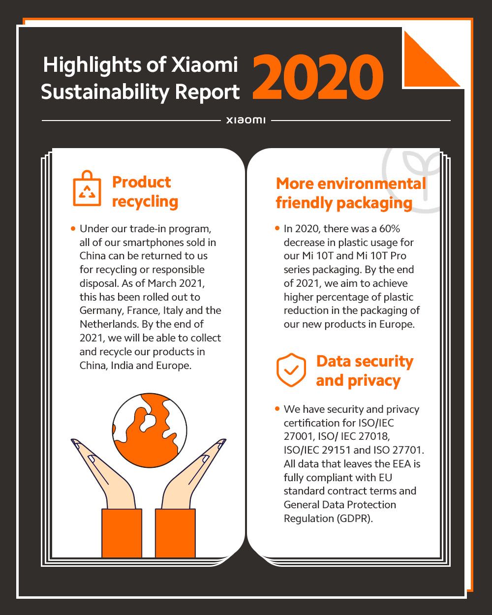 Về vấn đề môi trường, Báo cáo cũng mô tả cách Xiaomi đã kết hợp mục tiêu bảo vệ môi trường vào các khâu thiết kế và sản xuất sản phẩm. Một ví dụ cụ thể đó là hãng đã giảm 60% việc sử dụng nhựa đối với bao bì của dòng Mi 10T và Mi 10T Pro. Đến cuối năm 2021, Xiaomi đặt mục tiêu đạt được tỷ lệ giảm nhựa cao hơn đối với bao bì các sản phẩm mới ở châu Âu. Báo cáo cũng nhấn mạnh khả năng tiết kiệm năng lượng của Xiaomi đã trở thành một tính năng quan trọng của hơn 40 loại sản phẩm tiêu dùng. Theo Báo cáo ghi nhận, Xiaomi đảm bảo rằng các sản phẩm của công ty hoàn toàn tuân thủ tất cả quy định về môi trường và an toàn của các quốc gia nơi Xiaomi được bán. Các sản phẩm của Xiaomi tuân thủ các quy định của EU bao gồm Chỉ thị CE, REACH, RoHS và WEEE.