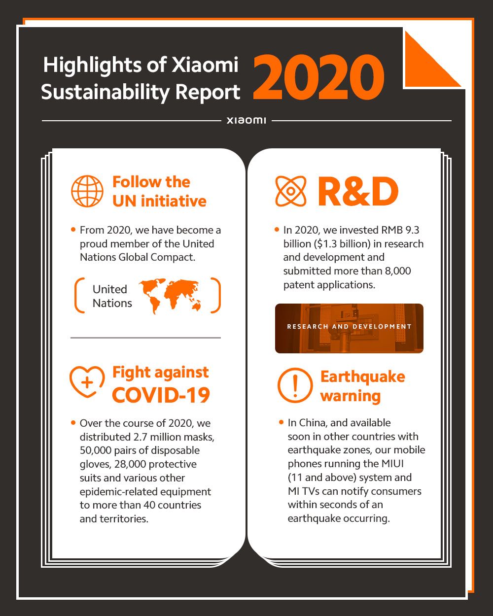 Bản báo cáo Bền vững với 30 trang nêu bật một loạt sáng kiến mang tính bền vững của Xiaomi bao gồm: bảo vệ môi trường, trách nhiệm xã hội của doanh nghiệp và quản lý chuỗi cung ứng bền vững, v.v... Bên cạnh đó, thông tin về cam kết của Xiaomi đối với khả năng truy cập, bảo mật dữ liệu và quyền riêng tư của người dùng cũng được cung cấp đầy đủ. Đây được coi là bản Báo cáo ghi lại hoàn chỉnh các sáng kiến về bền vững của Xiaomi đã được thực hiện tại thị trường Trung Quốc nói riêng các thị trường khác trên toàn thế giới nói chung.