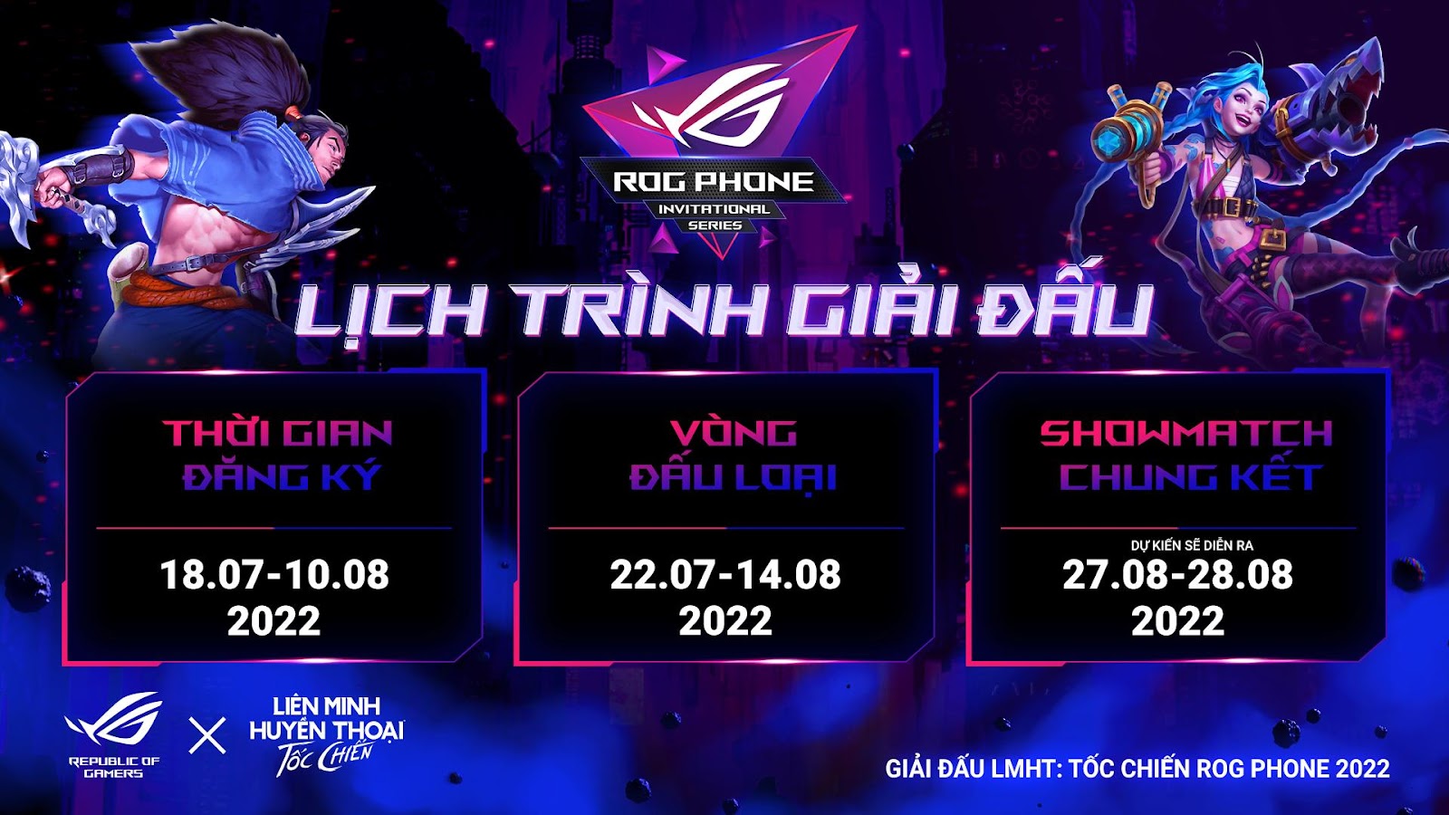 Vòng đấu loại sẽ diễn ra trong 4 tuần từ 22/07 – 13/08 để chọn ra 4 đội xuất sắc nhất. Sau đó, các thành viên 4 đội vô địch tuần sẽ kết hợp với các tuyển thủ chuyên nghiệp để tạo thành 8 đội tham dự Showmatch chung kết dự kiến diễn ra vào 27 – 28/08. Qua giải đấu này, ROG và VNG mong muốn đồng hành vào sự phát triển của nền thể thao điện tử chuyên nghiệp của bộ môn Liên Minh Huyền Thoại: Tốc Chiến tại Việt Nam. Đây là cơ hội cho những bạn game thủ trẻ được trang bị kiến thức, kỹ năng, tâm lý thi đấu thông qua môi trường thi đấu với các tuyển thủ chuyên nghiệp.