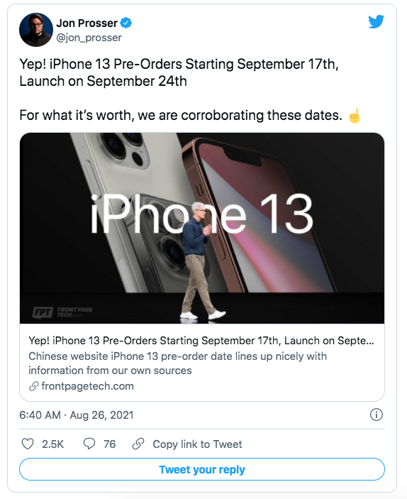 Ngày 7/9: Lời mời báo chí. Ngày 14: Công bố dòng iPhone 13. Ngày 17: Đơn đặt hàng trước. Ngày 24: Bán hàng đầu tiên.Hơn nữa, các báo cáo trước đó chỉ ra rằng Apple sẽ tăng giá iPhone. TSMC được cho là đã tăng chi phí sản xuất chipset và kết quả là Apple cũng sẽ phải tăng giá. Nếu tin đồn đưa ra các vòng quay trực tuyến là bất cứ điều gì xảy ra, công ty sẽ tăng giá của những chiếc iPhone mới lên 20% vào tháng 1/2022.