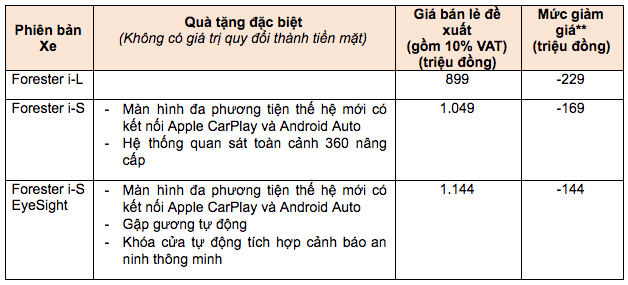 Gương gập tự động để nâng cao trải nghiệm tiện lợi và an tâm trong những hành trình Khóa cửa tự động tích hợp cảnh báo an ninh thông minh nhằm củng cố và tăng cường thêm sự an toàn dành cho khách hàngNgoài chương trình Hỗ trợ 100% Lệ phí Trước bạ, khách hàng còn được nhận thêm nhiều ưu đãi hấp dẫn khác khi mua xe Subaru Forester từ nay đến hết tháng 10.2021. Chi tiết giá đặc biệt và ưu đãi* cho từng phiên bản xe như sau: