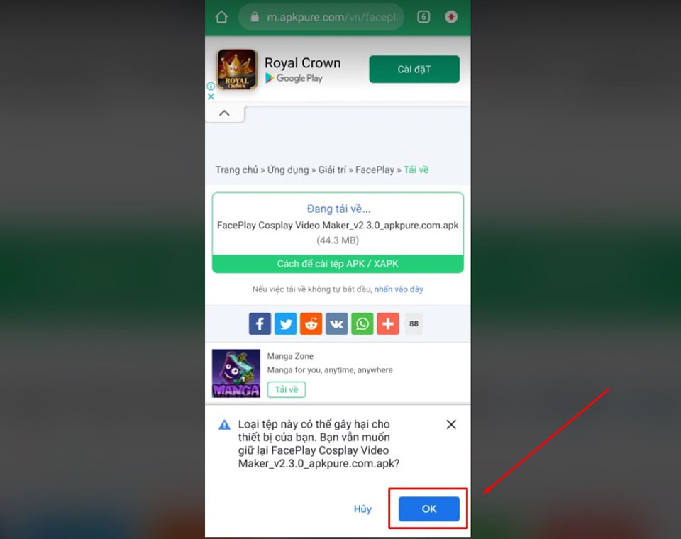 Bước 3: Lúc này sẽ có một cửa sổ nhỏ bật lên trên ở phần bên dưới màn hình của trình duyệt web để yêu cầu bạn xác nhận một lần nữa việc tải về tập tin APK từ trang web APKPure. Bạn nhấn OK để xác nhận và chờ cho tập tin tải về là được.