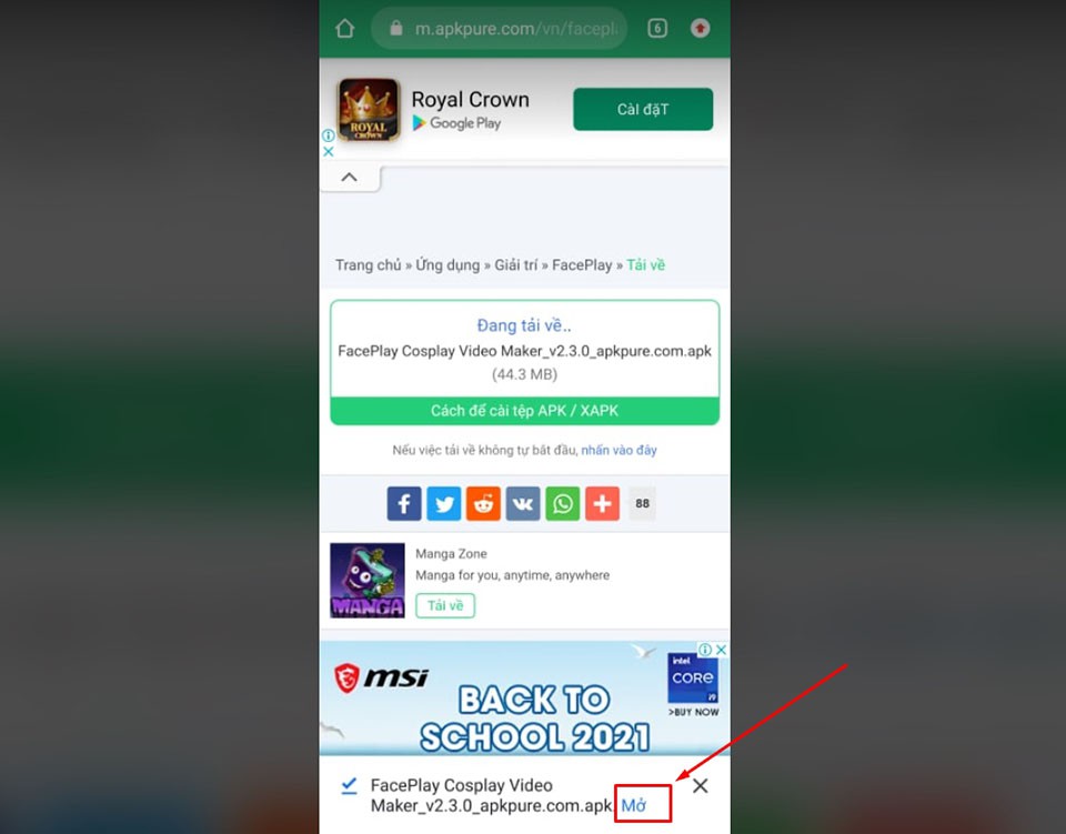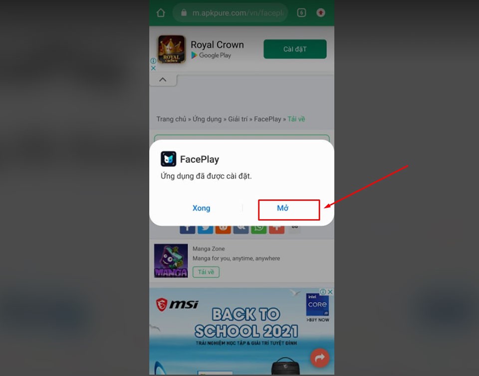 Bước 4: Sau khi tải tập tin về, bạn mở nó lên để cài đặt ứng dụng FacePlay. Nhấn vào nút Mở để thực hiện.
