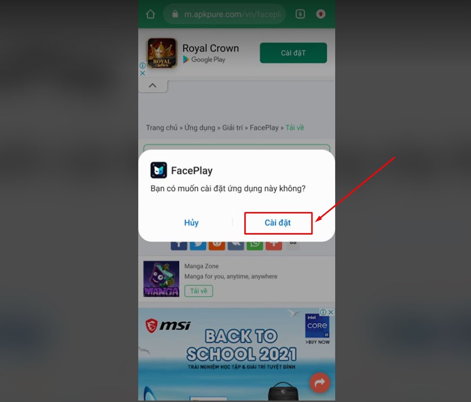 Bước 5: Trên màn hình sẽ xuất hiện một thông báo yêu cầu người dùng xác nhận việc cài đặt FacePlay. Bạn nhấn vào nút Cài đặt để xác nhận lại một lần nữa.
