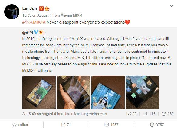 CEO Xiaomi xác nhận Mi MIX 4 sẽ ra mắt vào ngày 10/8 tới.
