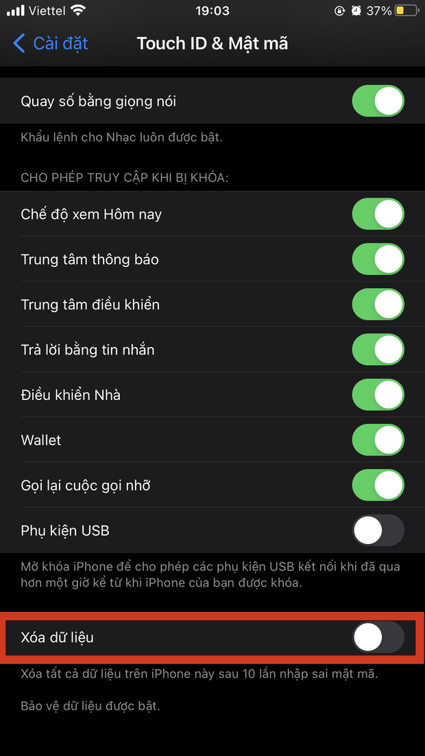 Vào phần Cài đặt -> chọn Face ID/Touch ID và mật mã -> chọn Nhập mật mã và sau đó cuộn xuống cuối trang. Tại mục Xoá dữ liệu bạn chọn trang thái “Bật” là được.