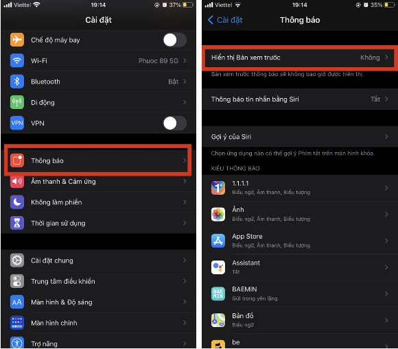 Để cài đặt tính năng này, bạn cần truy cập vào Cài đặt -> Thông báo -> Hiển thị bản xem trước và chọn Khi mở khoá hoặc Không bao giờ.