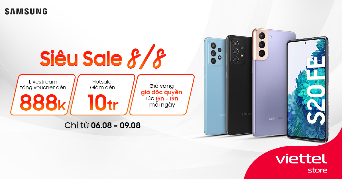 Theo đó, tại những nơi không áp dụng biện pháp giãn cách xã hội, Samsung siêu Sale 8.8 là chương trình tổng hợp giữa Hot Sale, Giờ vàng giá sốc và Livestream. Cụ thể, từ 6/8 đến 9/8/2021, Viettel Store ưu đãi giảm đến 9.000.000đ áp dụng với các sản phẩm: Galaxy S21 series 5G, Galaxy A52, Galaxy A72, Galaxy A32, Galaxy A12, Galaxy S20 FE, Galaxy A22. Khi mua kèm gói cước Viettel, khách hàng được ưu đãi thêm 1.000.000đ, nâng tổng ưu đãi tới 10.000.000đ.