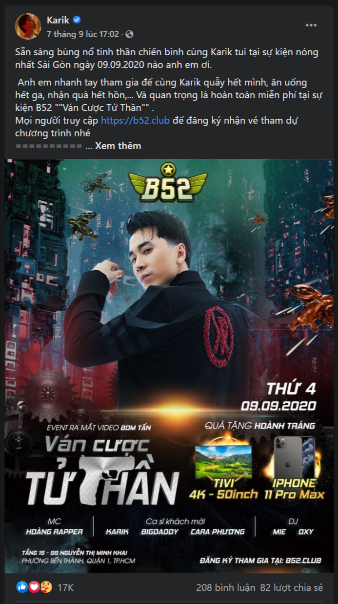 Sự tò mò của cư dân mạng được đẩy lên cao trào khi hàng loạt tên tuổi đình đám của giới trẻ cũng bắt đầu lên tiếng thông báo sẽ có mặt tại sự kiện nóng nhất Sài Gòn diễn ra ngày 9/9, trùng thời điểm với lịch hẹn úp mở của trailer phim Đại chiến B52 - Ván cược tử thần đã tung ra trước đó.