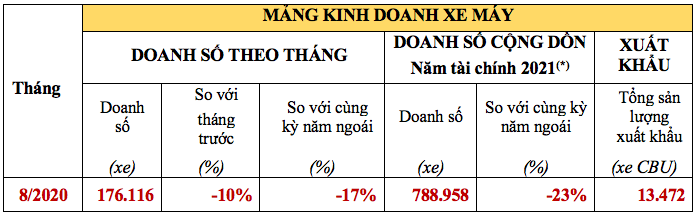 Ở mảng xe máy, toàn thị trường Việt Nam đã tiêu thụ được 176.116 xe trong tháng 8. Con số này giảm 10% so với tháng trước và giảm 17% so với cùng kỳ năm ngoái Cụ thể: