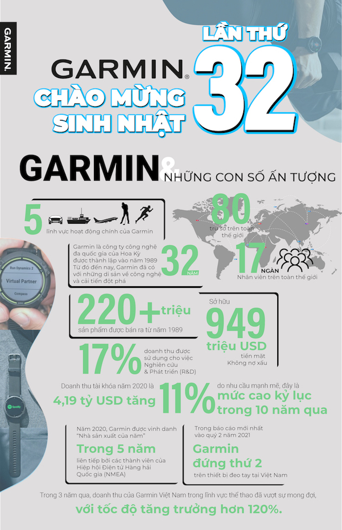 Trong suốt hơn ba thập kỷ vừa qua, Garmin được biết đến là đơn vị đi đầu về công nghệ và sáng tạo, đặc biệt là trong lĩnh vực thiết bị đeo thể thao và theo dõi sức khỏe. Tại Việt Nam, Garmin sẽ tổ chức nhiều hoạt động tri ân khách hàng, bao gồm chương trình ưu đãi đặc biệt nhân dịp sinh nhật hãng với mức ưu đãi lên đến 30% cho nhiều dòng sản phẩm đồng hồ thông minh được yêu thích.