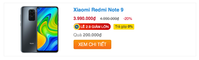 Redmi Note 9 có giá bán niêm yết 4.990.000 đồng hiện đang được giảm giá 1 triệu đồng. Như vậy, nếu mua Redmi Note 9 tại thời điểm này bạn chỉ cần thanh toán 3.990.000 đồng là đã có thể sở hữu một chiếc máy tầm trung mượt mà. Được biết chương trình ưu đãi này có hạn, vì vậy bạn hãy liên hệ các đại lý bán lẻ điện thoại chính hãng để sớm được chốt đơn nhé.