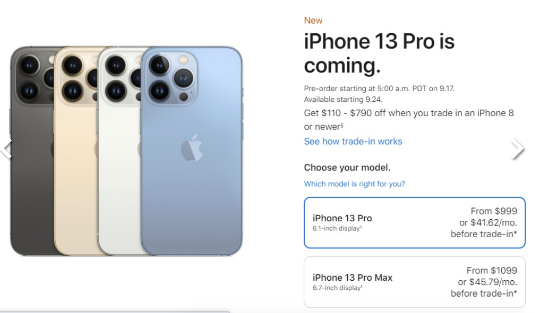 iPhone 13 Pro và 13 Pro Max cũng có một tuỳ chọn bộ nhớ mới là 1TB. Trong khi đó iPhone 13 Pro và 13 Pro Max có tuỳ chọn bộ nhớ tiêu chuẩn là 128GB. Vì vậy nếu bạn muốn sở hữu một chiếc iPhone 13 Pro hay 13 Pro Max có bộ nhớ 1TB thì sẽ phải chi thêm một khoản tiền nữa. Giá bán của bản 128GB thì cũng tương tự như iPhone 12 năm ngoái.