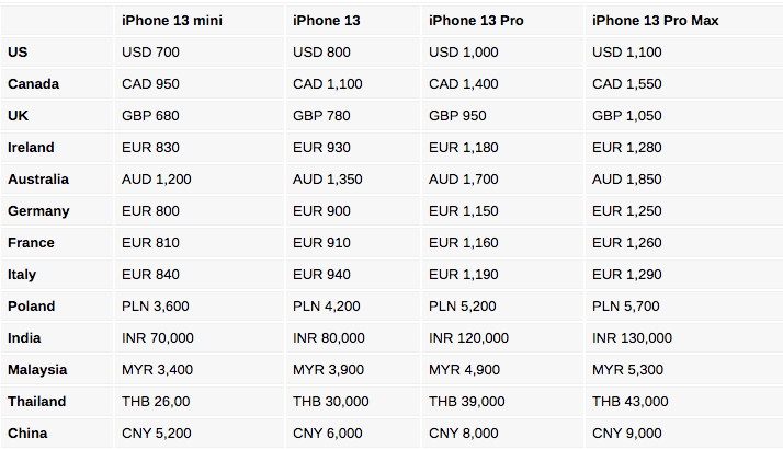 Dưới đây là bảng giá iPhone 13 tại các quốc gia khác nhau. Chúng tôi chỉ tổng hợp danh sách của phiên bản 128GB. Bạn cũng có thể tìm hiểu chi phí nâng cấp lên phiên bản bộ nhớ 256GB tại cửa hàng trực tuyến Apple tại nơi mình đang sinh sống.