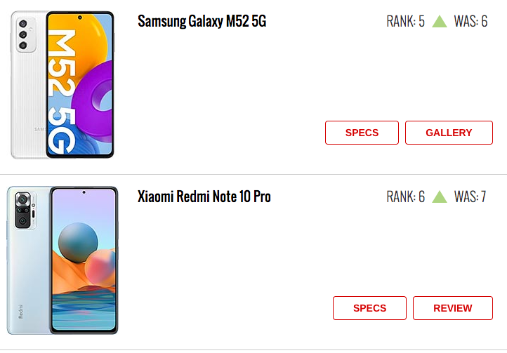 Xiaomi 11T Pro cũng giữ được vị trí thứ tư so với tuần trước. Trong khi đó vị trí thứ 5 có sự thay đổi đầu tiên với mẫu Galaxy M52 5G. Chiếc iPhone 13 mini chiếm vị trí này vào tuần trước thì nay đã hoàn toàn rớt khỏi bảng xếp hạng và nhường chỗ cho Galaxy M52 5G.