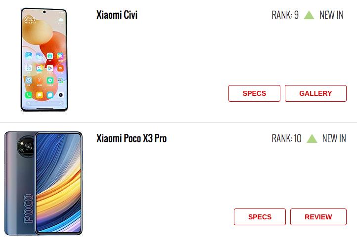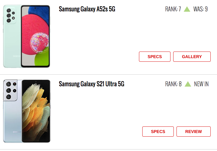 Cặp đôi Galaxy A52s và S21 Ultra của Samsung đứng ở vị trí thứ 7 và thứ 8 trong bảng xếp hạng. Trong khi vị trí thứ 9 thuộc về Xiaomi Civi, sản phẩm đang được mọi người quan tâm ngay cả trước khi công bố chính thức.