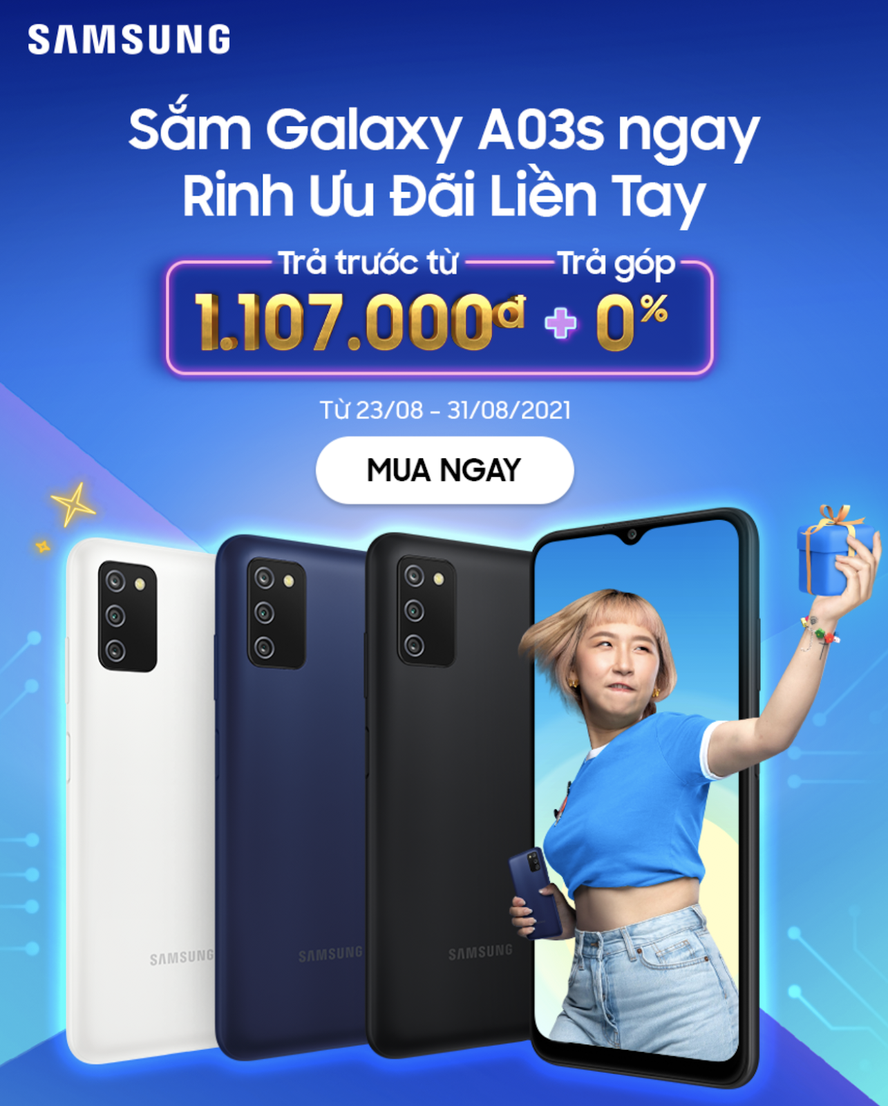 Hiện tại, Galaxy A03s đang được bán ra tại các đại lý kèm mức giá vô cùng ưu đãi với mức giá bán lẻ khuyến nghị là 3.690.000 đồng kèm các gói khuyến mại khủng, bao gồm chương trình trả góp 0% kể từ ngày 23/08 – 31/08/2021. Bạn chỉ cần trả trước từ 1.107.000 đồng là đã có cơ hội sở hữu một chiếc smartphone cực kỳ xịn xò. Ngoài ra, khách hàng mua Galaxy A03s sẽ được các chuyên viên Samsung tư vấn chuyên nghiệp với hệ thống cửa hàng bào hành phủ kín khắp cả nước.