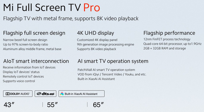 Các mẫu Mi TV Pro còn tích hợp các công nghệ như Dolby Audio, trợ lý ảo XiaoAI, điều khiển bằng giọng nói và hỗ trợ kết nối với các thiết bị IoT và hiển thị trạng của các thiết bị ghép nối để điều khiển. Điểm đặc biệt là Mi TV Pro chỉ được trang bị màn hình 4K nhưng dòng TV này vẫn có thể đọc được các nội dung độ phân giải 8K một cách mượt mà.