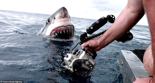 Để ghi lại khoảnh khắc chân thực nhất, Dave Riggs liều lĩnh giơ máy quay trước hàm con cá mập trắng lớn - loài vật được xem như hung thần đại dương.
