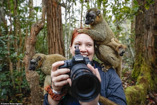 Đàn vượn cáo ở Madagascar khoái chí, trèo lên vai cô gái, vò tóc như đang chơi đùa với bạn mình.