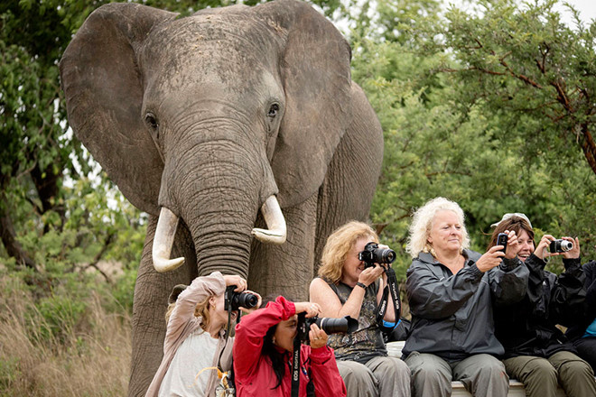Nhóm khách chăm chú chụp ảnh không để ý con voi xuất hiện phía sau