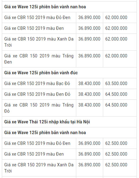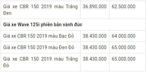 Dưới đây là bảng giá tất cả các phiên bản của dòng Wave Thái 125i nhập khẩu tháng 10/2019 đã bao gồm VAT, chưa tính thuế trước bạ, phí cấp biển số cho bản vành nan hoa và bản mâm đúc tại các đại lý bán xe tư nhân để khách hàng tham khảo: