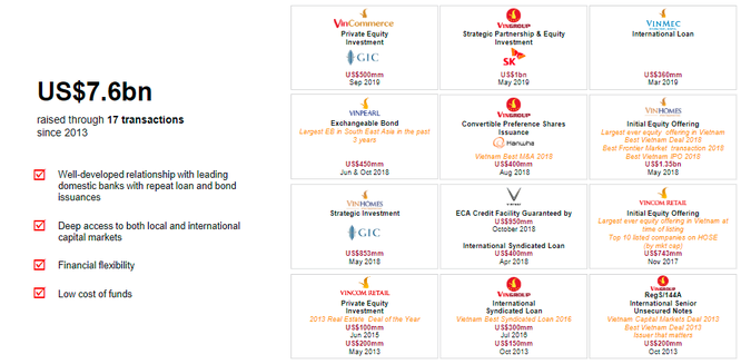 Đáng chú ý nhất, phải kể đến những thương vụ huy động vốn quốc tế ‘đình đám’. Đầu tiên, ấn tượng nhất là con số huy động vốn lên tới 1,35 tỷ USD, xuất phát từ hoạt động chào bán cổ phiếu lần đầu của Vinhomes diễn ra vào tháng 5/2018. Không lâu sau đó, tập đoàn này cũng nhận được 1 tỷ USD từ tập đoàn SK Group thông qua thỏa thuận hợp tác chiến lược. Tiếp theo là 2 khoản đầu tư vào VinCommerce và Vinhomes với giá trị ghi nhận lần lượt đạt 500 triệu và 853 triệu USD từ quỹ đầu tư GIC của Chính phủ Singapore. Riêng lĩnh vực sản xuất ô tô, cơ quan Tín dụng xuất khẩu thuộc Chính phủ Đức đã thực hiện bảo lãnh khoản vay có giá trị lên tới 950 triệu USD cho VinFast để nhập khẩu máy móc thiết bị, phục vụ sản xuất…