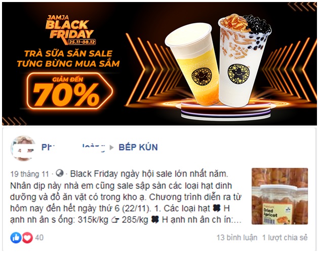 Đáng chú ý, có vẻ như không bỏ lỡ dịp nãy nhiều chỉ shop bán các mặt hàng đồ ăn, đồ uống hay những thức bánh tái vỉa hè cũng tưng bừng khuyến mãi Black Friday. Đây quả là dịp để các tín đồ ăn uống, nghiện trà sữa tranh thủ thưởng thức những món khoái khẩu siêu hời. Bởi bình thường chỉ thấy quần áo, thời trang, túi… mới giảm giá vào dịp này chứ hiếm thấy đồ ăn, thức uống giảm giá.