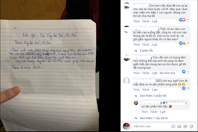 Nội dung bức thư viết: “Kính gửi các ông bà, bác, cô, chú. Thưa ông, bà, cô, chú. Cháu sinh năm 2003, không may cháu mang thai và sinh con trai vào lúc 23h00’ ngày 02/11/2019. Vì cháu còn là học sinh PTTH. Hoàn cảnh gia đình cháu không thể nuôi được con. Vậy kính mong ông bà, bác, cô chú nuôi giúp con cho cháu. Cháu vô cùng đội ơn!”.