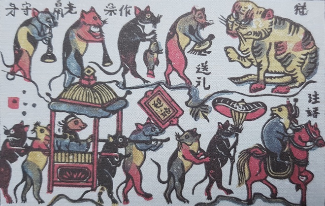Tranh "Đám cưới chuột" thuộc dòng tranh Hàng Trống. Tranh thể hiện đám rước gồm có mèo, đàn chuột mang đồ cống với cá, gà, các nhạc công chuột, chuột cầm đèn cùng tân lang, tân nương chuột và nhóm khiêng kiệu, nhóm cầm cờ ngũ sắc.