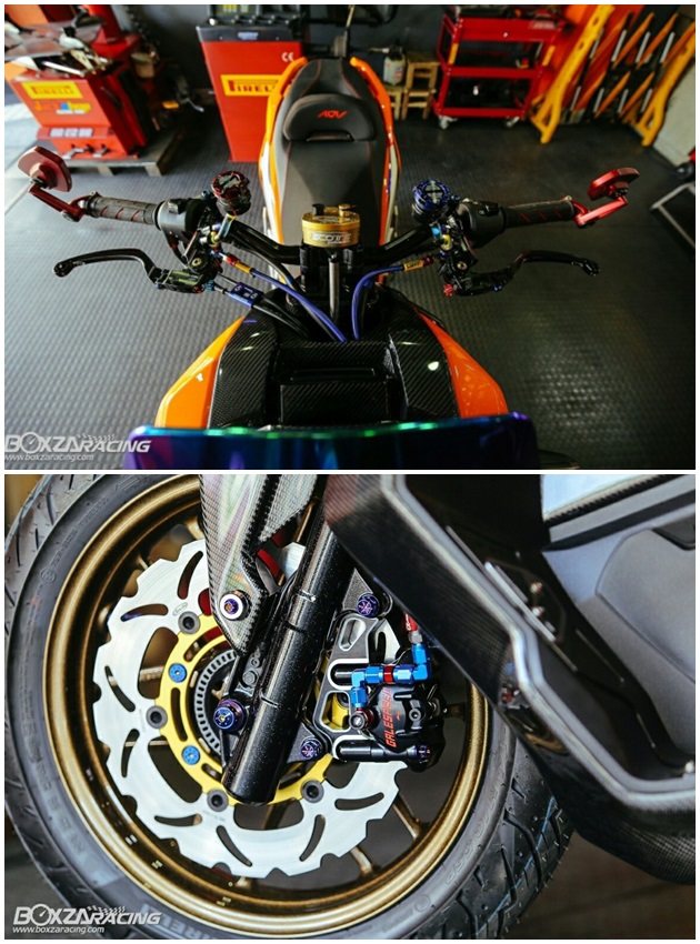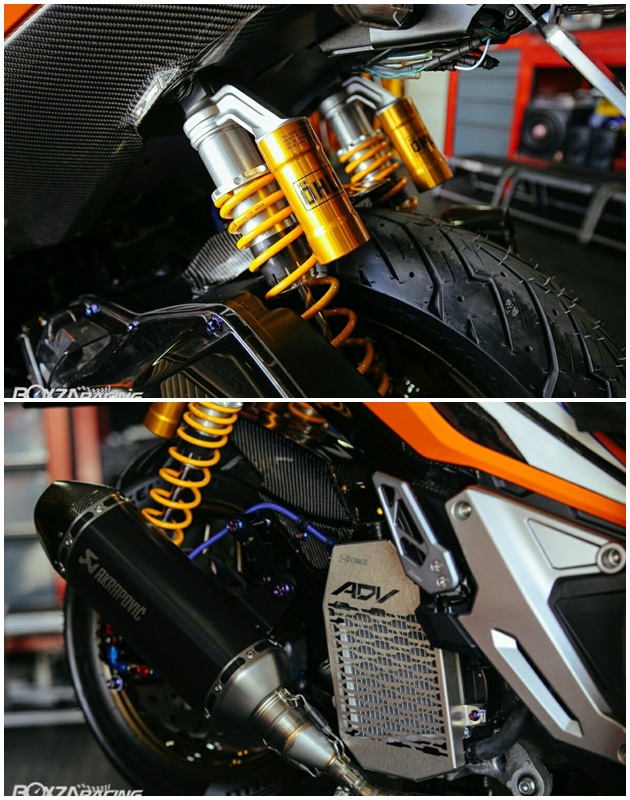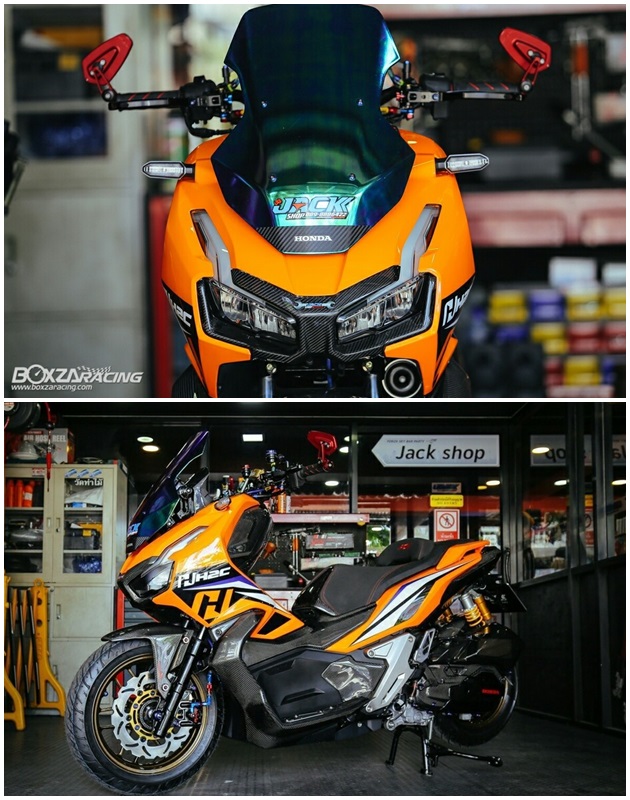 Với phong cách độ hiện đại, trẻ trung chiếc ADV 150 đã được chủ nhân lột xác với bộ áo ngoài bắt mắt người xem, tone màu cam nổi bật đi kèm bộ tem chủ đạo trắng đen. Tiếp đến là 16 chi tiết được ốp Carbon tăng sự sang trọng cho chiếc xe. Đi kèm là nhiều món đồ chơi không những hướng kiểng mà còn tăng cường hiệu năng hoạt động cho bản độ này.