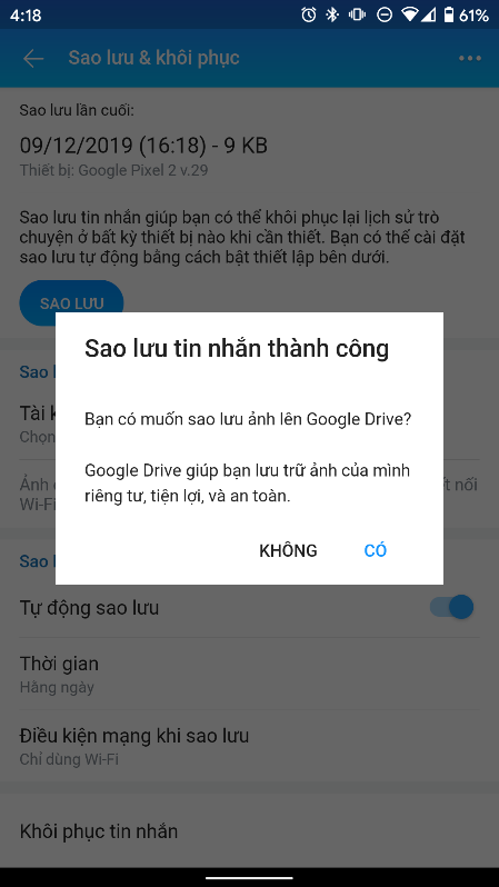 Mặc định, ứng dụng sẽ sao lưu dữ liệu lên máy chủ của Zalo. Tuy nhiên, nếu sử dụng Android, bạn có thể thiết lập để nó sao lưu tin nhắn lên Google Drive.