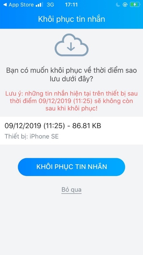 Khi cần khôi phục tin nhắn, cũng thao tác tương tự như khi sao lưu, nhưng ở Bước 3: Chọn tùy chọn Khôi phục dữ liệu thay vì Sao lưu dữ liệu. Cuối cùng, duyệt đến vị trí mình lưu file sao lưu trước đó, và bấm nút Khôi phục.