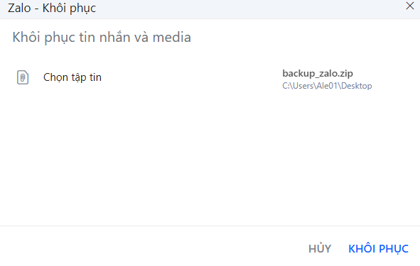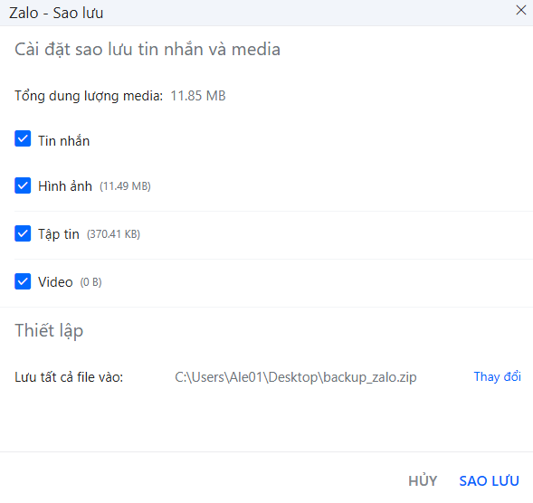 Mặc định, Zalo sẽ lưu file sao lưu dưới dạng một file .zip trong thư mục Desktop. Trường hợp, muốn lưu file sao lưu vào vị trí khác, chỉ cần bấm nút Thay đổi tại mục Lưu tất cả file vào, và chọn vị trí mong muốn.