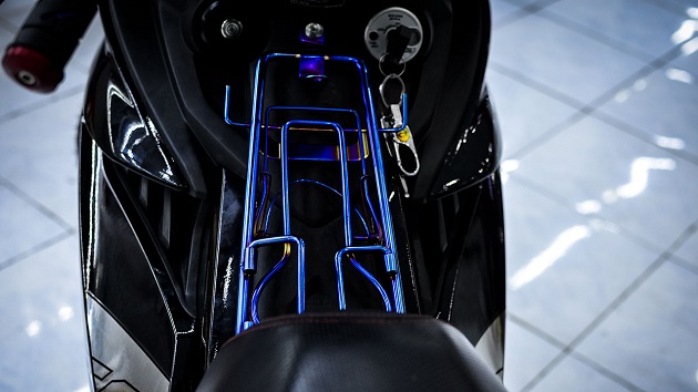 Bản độ này còn trang bị dàn đồ chơi đắt giá, đang thịnh hành hiện nay như pô MIVV đi kèm cổ pô titan với luồng hơi thở đặc biệt. Chỉ cần nẹt ga, tiếng nổ âm vang sẽ khiến ai cũng phải chú ý với vẻ hầm hố của chiến mã này. Cùng với đó là cổ pô titan với màu sắc và kiểu dáng đẹp khiến nhiều biker đứng ngồi không yên. Cổ pô sử dụng chất liệu titan siêu cứng, không dễ bị gỉ và chịu được nhiệt độ cao hơn các loại pô thông thường.