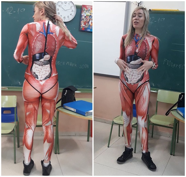 Mới đây, một giáo viên người Tây Ban Nha tên Verónica Duque bất ngờ nổi tiếng và nhận được nhiều lời khen từ cộng đồng mạng. Được biết, trước đó không lâu chồng của cô là Michael đã chia sẻ những hình ảnh cô đang dạy trên lớp cùng bộ độ bó sát dạy về giải phẫu cơ thể người cho các em học sinh tầm 8 – 9 tuổi cùng dòng trạng thái vô cùng mùi mẫn: “Rất tự hào về ý tưởng bá đạo này. Hôm nay, cô ấy truyền tải kiến thức về giải phẫu cho học sinh một cách rất chân thực. Những đứa trẻ cũng thấy kinh ngạc. Verónica tuyệt vời!”