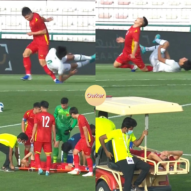Cận cảnh pha bóng khiến Liễu Quang Vinh chấn thương và phải rời sân bằng cáng.