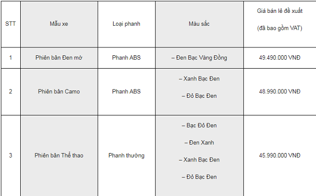 Còn tại Hà Nội, giá bán mẫu xe này đang giao động 46,4-51,2 triệu, chưa bao gồm chi phí ra biển số. Có thể thấy, mức giá này nhỉnh hơn khoảng 400.000 đồng đến 1,7 triệu đồng so với mức đề xuất của hãng.