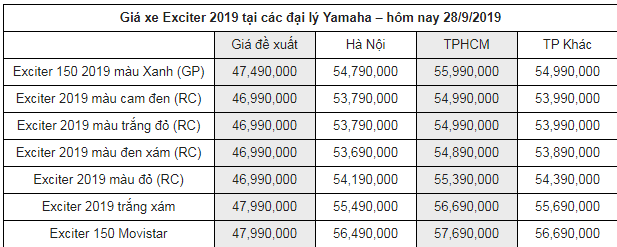 Dễ dàng nhận thấy các mẫu xe Yamaha Exciter sau khi về các đại lý đều được bán với giá đắt hơn vài triệu đồng so với giá đề xuất, thậm chí có nơi giá bán thực tế chênh khoảng 5-7 triệu đồng so với mức đề xuất của hãng. Cụ thể, mẫu Yamaha Exciter 2019 tại các đại lý đang đội lên cao hơn so với giá đề xuất từ 4 - 6 triệu VNĐ với hai phiên bản được phân phối gồm: Exciter 150 GP và Exciter 150 RC với giá đề xuất của nhà sản xuất lần lượt là 47,49 triệu VNĐ và 46,99 triệu VNĐ. Exciter 2019.