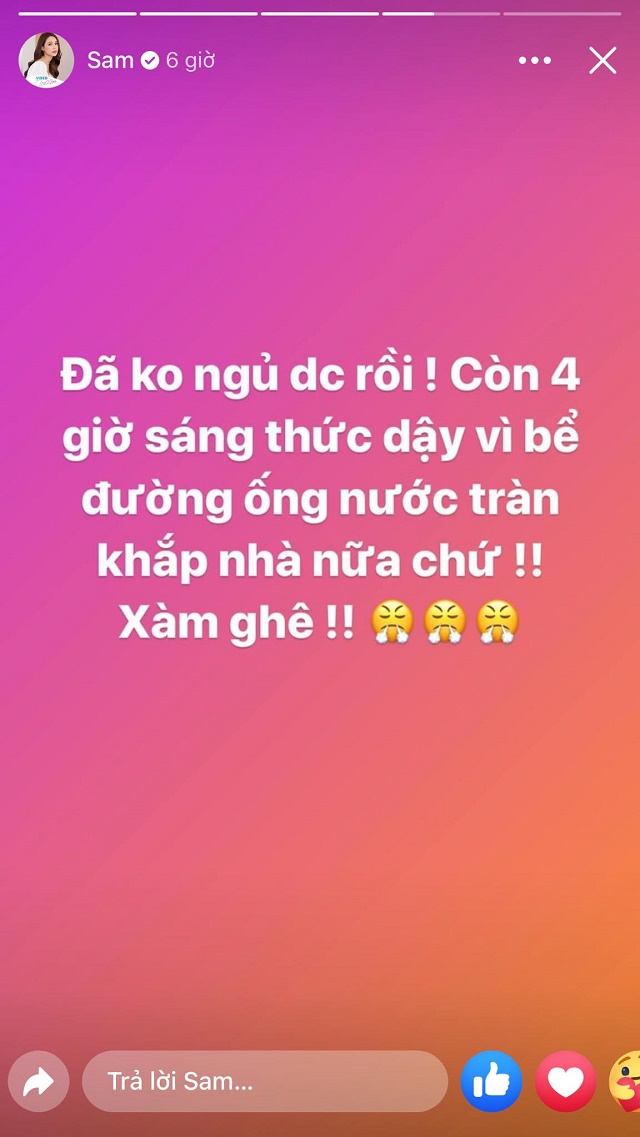 Mới đây, Sam bất ngờ đăng tải trên story Facebook dòng trạng thái: "Đã không ngủ được rồi! Còn 4 giờ sáng thức dậy vì bể đường ống nước tràn khắp nhà nữa chứ!! Xàm ghê!!".