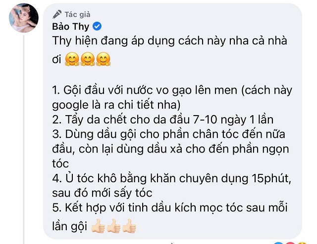 Không chỉ có lợi thế là làn da trắng sứ, đường nét gương mặt vừa sắc sảo lại vừa ngọt ngào, Bảo Thy còn khiến nhiều chị em "ganh tị" vì mái tóc đen dày, bóng mượt. Dưới phần bình luận, nàng "công chúa bong bóng" tiết lộ luôn bí kíp:
