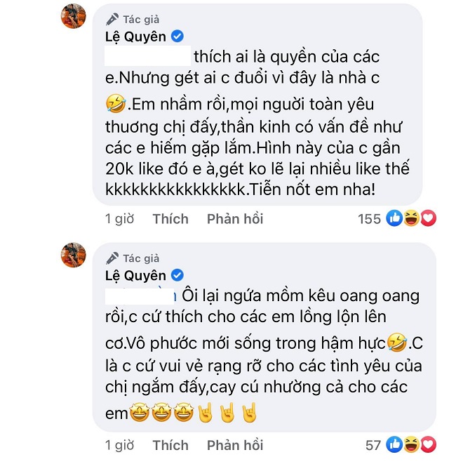 Trước dòng bình luận dài cho rằng bản thân đang cố tỏ ra hạnh phúc sau thất bại hôn nhân, thậm chí còn bị đánh giá là kém tinh tế so với nhiều sao nữ khác, Lệ Quyên đáp trả đầy sâu cay: "Em cũng vô công rỗi nghề nên lại đi dạy đời trong khi làm hạt bụi bám gấu váy người khác chưa xong em ơi. Chị chia sẻ niềm hạnh phúc của chị cho biết bao nhiêu người yêu thương chị chứ đâu có cần thành phần như em cảm thấy ngứa mắt nhỉ. Lo cho bản thân đi, thời gian còn lại lo cho người thân nữa, như chị đây này. Nếu không được vui vẻ hạnh phúc thì cũng đừng uất ức với người khác em ơi. Cứ hóng và la liếm xong lại cay cú rè bỉu là sao nhỉ. Tốt nhất là đừng để chị phải đuổi, em tự về cái nơi hợp với em mà tồn tại nha. Gửi em và thành phần giống em luôn cho tiện. Tiễn em".