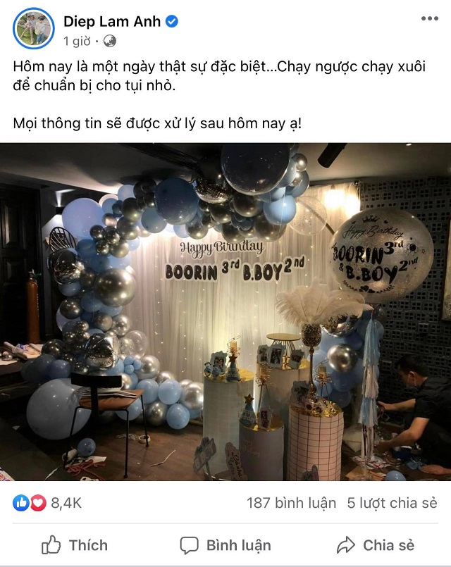 Đối với Diệp Lâm Anh, hôm nay (31/10) là một ngày đặc biệt - sinh nhật của 2 con. Do đó người đẹp vô cùng bận rộn chuẩn bị tiệc và có lẽ không muốn phá hỏng ngày vui vẻ của con nên cho biết sẽ xử lý mọi thông tin sau. Nhiều khán giả cho rằng hành động của người đẹp cực kì tinh tế, thể hiện sự thương yêu đối với các con.