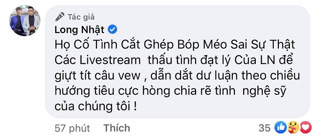 Long Nhật cho rằng những phát ngôn của anh đang bị cắt ghép, bóp méo sự thật và thông điệp muốn truyền đạt nhằm gây chia rẽ nghệ sĩ: "Họ cố tình cắt ghép, bóp méo sai sự thật các livestream thấu tình đạt lý của Long Nhật để giật tít câu view, dân dắt dư luận theo chiều hướng tiêu cực nhằm chia rẽ tình nghệ sĩ của chúng tôi", anh nhấn mạnh thêm.