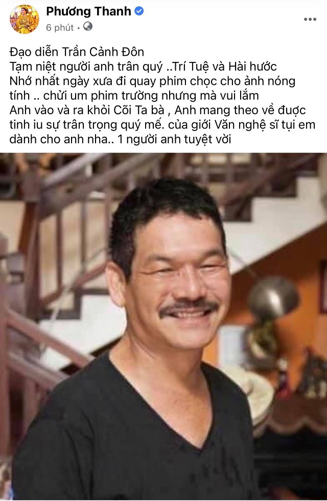Mới đây, trên trang Facebook cá nhân, ca sĩ Phương Thanh đã có lời chia sẻ xúc động khi hay tin đạo diễn Trần Cảnh Đôn qua đời. Cụ thể, cô viết: