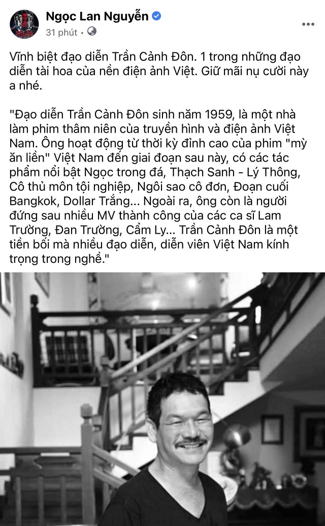 Nữ diễn viên Ngọc Lan cũng không giấu được sự bàng hoàng khi người anh mà cô trân quý đột ngột ra đi. "Vĩnh biệt đạo diễn Trần Cảnh Đôn. 1 trong những đạo diễn tài hoa của nền điện ảnh Việt. Giữ mãi nụ cười này a nhé".