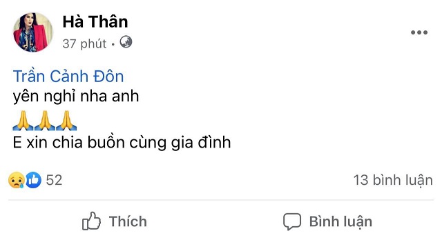 Nhận được tin dữ, Thân Thúy Hà cũng có đôi lời tiễn biệt đạo diễn Ngôi Sao Cô Đơn: "Trần Cảnh Đôn, yên nghỉ nha anh. Em xin chia buồn cùng gia đình".