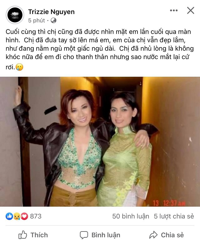 "Cuối cùng thì chị cũng đã được nhìn mặt em lần cuối qua màn hình. Chị đã đưa tay sờ lên má em, em của chị vẫn đẹp lắm, như đang nằm ngủ một giấc ngủ dài. Chị đã nhủ lòng là không khóc nữa để em đi cho thanh thản nhưng sao nước mắt lại cứ rơi".