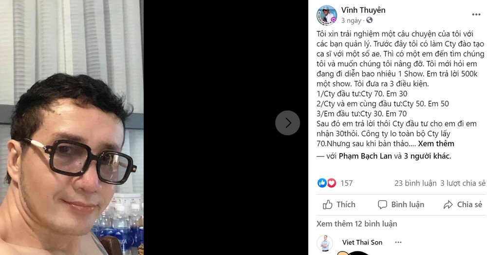Mới đây, bầu show Vĩnh Thuyên - một người có thâm niên trong việc quản lý, lăng xê nhiều nghệ sĩ như Lý Hải, Vĩnh Thuyên Kim,... đã chia sẻ lên MXH một bài viết dài kể lại câu chuyện làm quản lý. Cụ thể, ông cho biết bản thân từng làm công ty đào tạo ca sĩ và nâng đỡ một ca sĩ trẻ có cát xê xuất phát điểm là 500.000 đồng.