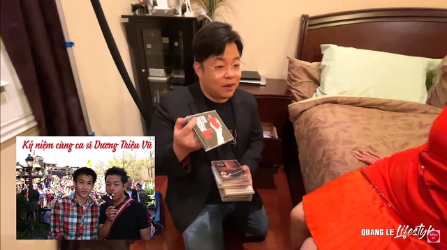 Nói thêm về nơi riêng tư của mình, Quang Lê tiết lộ sở thích sưu tầm băng đĩa cổ và kể về kỉ niệm đẹp với em ruột Hoài Linh - ca sĩ Dương Triệu Vũ: "Trong phòng này nhiều đồ cổ lắm vì lâu tôi không ở. Chiếc tivi này tôi mua lâu lắm rồi, ngày xưa ở nhà hay coi lắm nhưng lâu lắm không mở lên, không biết bây giờ còn hoạt động được không.
